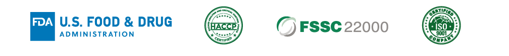 Our manufacturing facilities hold ISO9001, FSSC 22000, FDA and HACCP certifications that guarantee the quality of our products and services.
