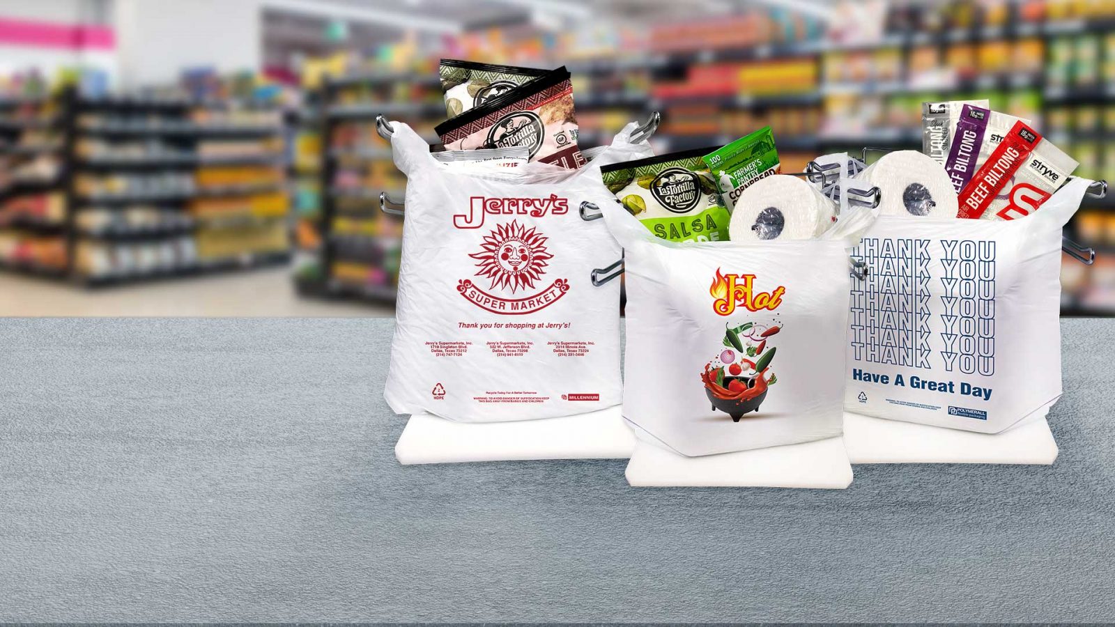 Polymerall produces high-quality HDPE custom logo printed shopping bags in up to 6 colors.